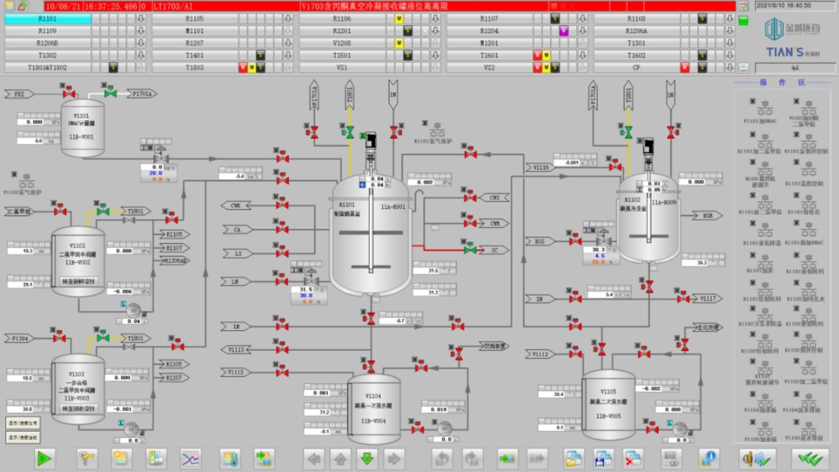 本項(xiàng)目中采用的雙滴加自動(dòng)控溫、自動(dòng)分相、稱重自動(dòng)濃縮、PH自動(dòng)控制以及配套回收系統(tǒng)全自動(dòng)一鍵啟車等一系列先進(jìn)的合成工藝控制技術(shù),并且所有過程數(shù)據(jù)自動(dòng)儲(chǔ)存,可隨時(shí)調(diào)取查詢,保證生產(chǎn)過程數(shù)據(jù)完整性、可追溯性,成功助力自動(dòng)化生產(chǎn)。多種技術(shù)的應(yīng)用讓該項(xiàng)目工藝參數(shù)控制更加精準(zhǔn),減小了人為操作與干預(yù),增強(qiáng)了生產(chǎn)過程中的可控性,實(shí)現(xiàn)了自動(dòng)化工廠新理念。